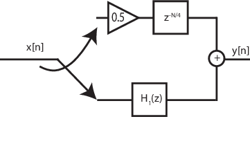 Для полуполосного фильтра единственным ненулевым коэффициентом в четной полифазной составляющей является коэффициент, соответствующий z0. Реализация полуполосного фильтра в качестве каузального КИХ-фильтра сдвигает ненулевой коэффициент приблизительно на z-N/4, где N - количество отводов фильтра. Этот процесс проиллюстрирован на следующем рисунке.