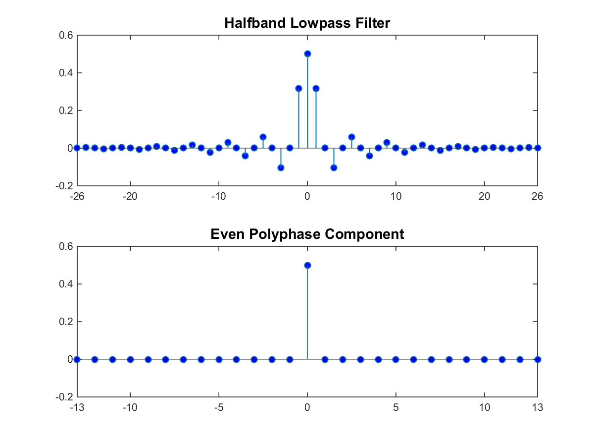 На верхнем графике показан полуполосный фильтр порядка 52. На нижнем графике показан четный полифазный компонент. Оба этих фильтра некаузальны. Задержка четного полифазного компонента на 13 образцов создает причинный КИХ-фильтр.