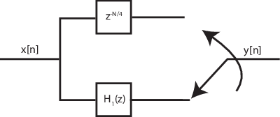 Для полуполосного фильтра единственным ненулевым коэффициентом в четной полифазной составляющей является коэффициент, соответствующий z0. Реализация полуполосного фильтра в качестве каузального КИХ-фильтра сдвигает ненулевой коэффициент приблизительно до z-N/4, где N - количество отводов фильтра. Этот процесс показан на следующем рисунке.