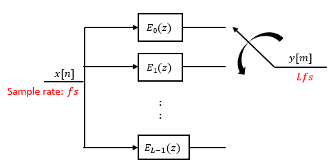 Оператор повышающей дискретизации, блок задержки и сумматор можно заменить коммутатором. Переключатель запускается на первой ветви 0 и перемещается в направлении против часовой стрелки, каждый раз получая по одной выборке от каждой ветви. Интерполятор эффективно выводит L выборок для каждой входной выборки, которую он принимает. Следовательно, частота дискретизации на выходе фильтра интерполяции КИХ равна Lfs.