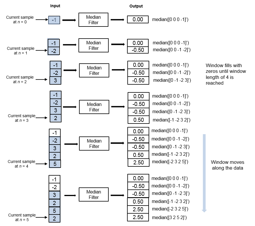 dsp.MedianFilter Система object™ вычисляет скользящую медиану входного сигнала по каждому каналу независимо во времени. Объект использует метод скользящего окна для вычисления движущейся медианы. В этом способе окно заданной длины перемещается по каждому каналу, выборка за выборкой, и объект вычисляет медиану данных в окне. Дополнительные сведения см. в разделе Алгоритмы.