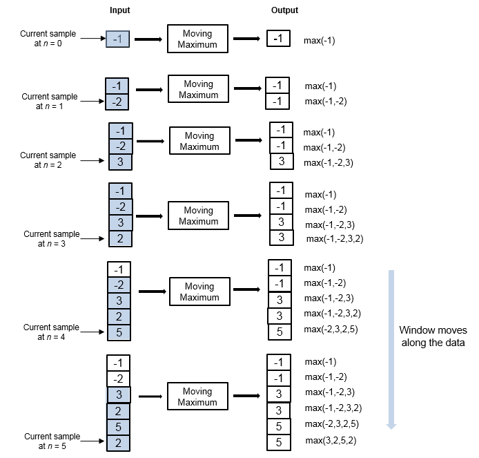 dsp.MovingMaximum Система object™ определяет подвижный максимум входного сигнала по каждому каналу независимо во времени. Объект использует метод скользящего окна для определения скользящего максимума. В этом методе окно заданной длины перемещается по каждому каналу, выборка за выборкой, и объект определяет максимум данных в окне. Дополнительные сведения см. в разделе Алгоритмы.