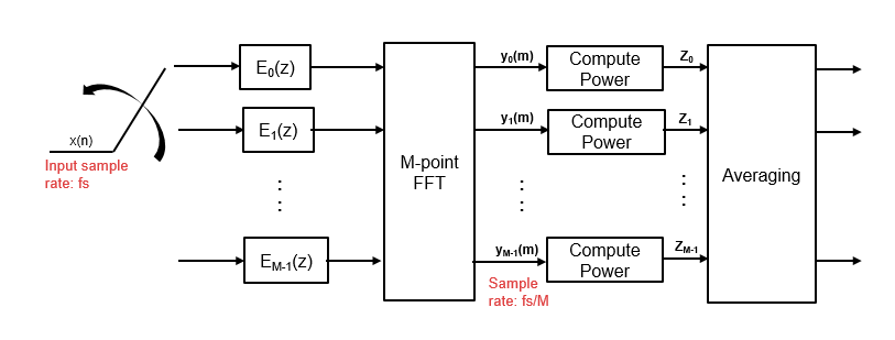 Блок фильтров разделяет широкополосный входной сигнал x (n) скорости выборки fs на множество узкополосных сигналов y0 (m), y1 (m),..., yM-1 (m) скорости выборки fs/M.