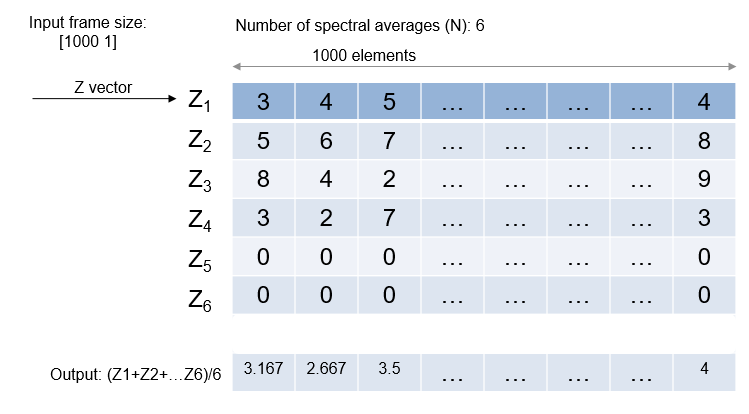 Running - Для каждого кадра ввода усредняют последние N масштабированных Z векторов, которые вычисляются алгоритмом. Переменная N - это значение, указанное для количества спектральных средних значений. Если алгоритм не имеет достаточно Z векторов, алгоритм использует нули для заполнения пустых элементов.