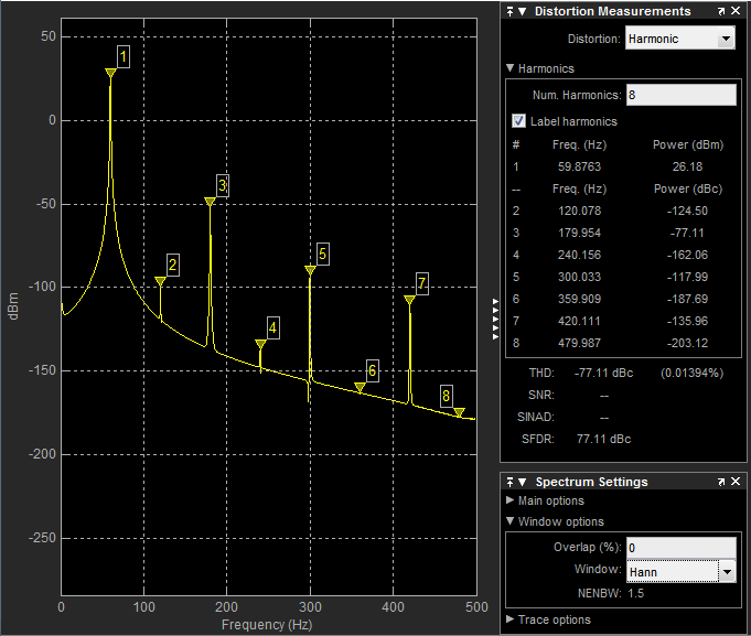 Измерения гармонических искажений используют трассу спектра, показанную на дисплее, в качестве входных данных для измерений. Дефолт Hann установка окна анализатора спектра может привести к утечке, которая может полностью маскировать уровень шума измеряемого сигнала.