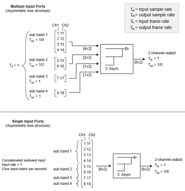 Количество уровней банков фильтров. Асимметричная структура n-уровня имеет n + 1 входов, а симметричная структура n-уровня имеет 2n входов, как показано в Vavelet Filter Banks.