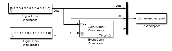 В модели ex_eventcountcomp_ref блок компаратора количества событий (порог события = 3) обнаруживает два пересечения порога на входе в порт данных, одно в выборке 4 и одно в выборке 12.