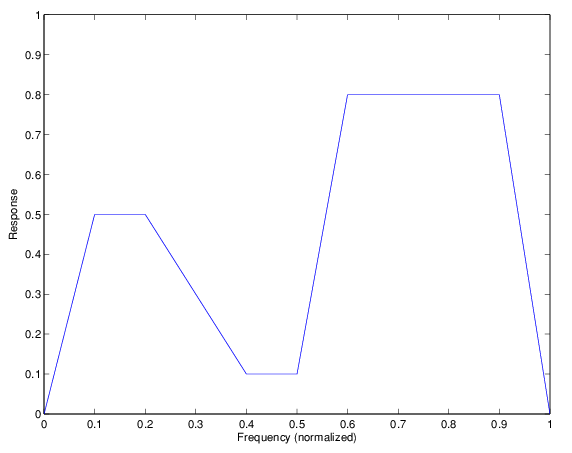 f и h - входные аргументы, используемые для определения требуемого отклика фильтра. Каждое значение частоты, указанное в f должно иметь соответствующее значение ответа в h. В этом примере создается фильтр с двумя полосами пропускания (b = 4) и показывает, как f и h связаны между собой. Этот пример приведен только для иллюстрации. Он не является фактическим фильтром.