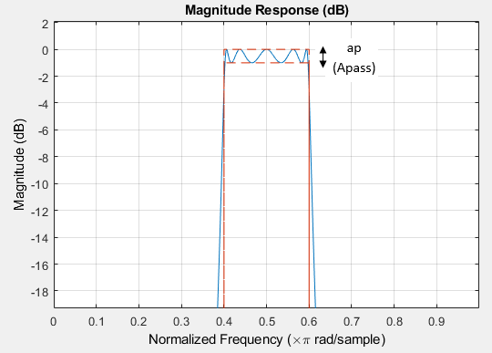 ap - Пульсация полосы пропусканияПульсация полосы пропускания, заданная как положительный скаляр в дБ. Если magunits является 'linear' или 'squared', пульсация полосы пропускания преобразуется и сохраняется в дБ функцией независимо от того, как она была указана.