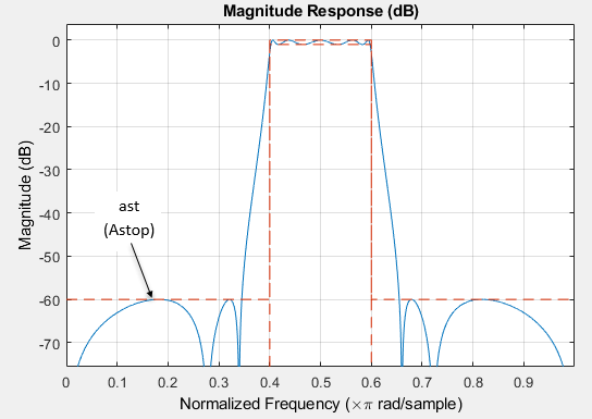 ast - Затухание полосы остановаЗатухание полосы останова, указанное как положительный скаляр в дБ. Если magunits является 'linear' или 'squared'затухание полосы останова преобразуется и сохраняется в дБ функцией независимо от того, как она была задана.