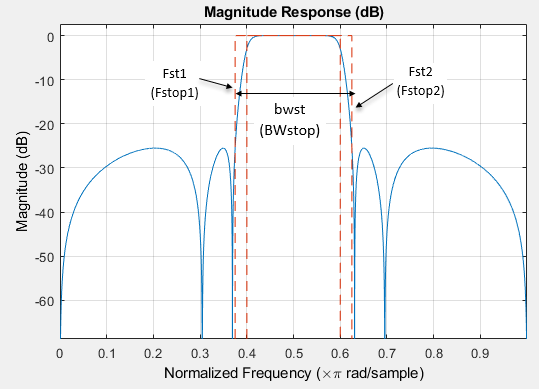 fst1 - Первая частота полосы остановаПервая частота полосы останова, заданная как положительный скаляр в нормированных частотных единицах.