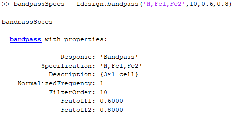 Рассмотрим пример, где spec аргумент имеет значение 'N,Fc1,Fc2', и соответствующие значения устанавливаются как 10, 0.6, и 0.8соответственно. bandpass объект спецификации конструкции фильтра заполняется следующими полями: