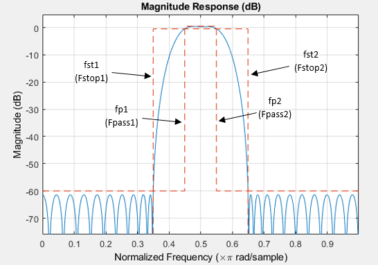 bandpassSpecs = fdesign.bandpass('Fst1,Fp1,Fp2,Fst2,Ast1,Ap,Ast2', ... 1/4,3/8,5/8,6/8,60,1,60);