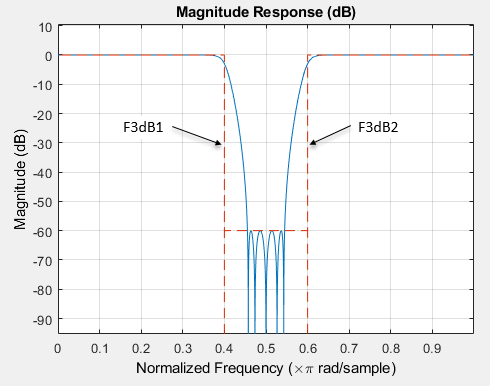 Рассмотрим следующую спецификацию проектирования bandstop, в которой обе полосы пропускания ограничены значением по умолчанию, 1 дБ.