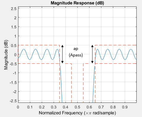 ap - Пульсация полосы пропусканияПульсация полосы пропускания, заданная как положительный скаляр в дБ. Если magunits является 'linear' или 'squared', пульсация полосы пропускания преобразуется и сохраняется в дБ функцией независимо от того, как она была указана.