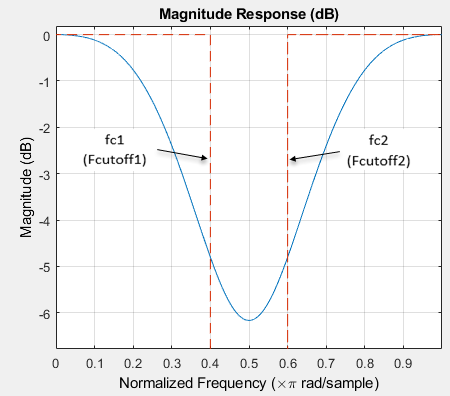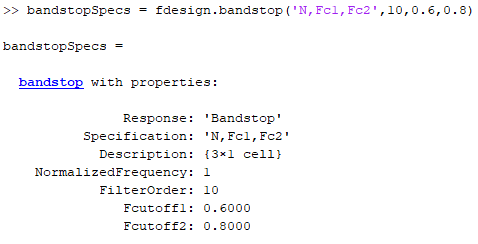 Рассмотрим пример, где spec аргумент имеет значение 'N,Fc1,Fc2', и соответствующие значения устанавливаются как 10, 0.6, и 0.8соответственно. bandstop объект спецификации конструкции фильтра заполняется следующими полями: