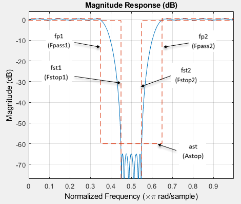 Области между значениями спецификации, например Fp1 и Fst1 - переходные области, в которых отклик фильтра явно не определен.