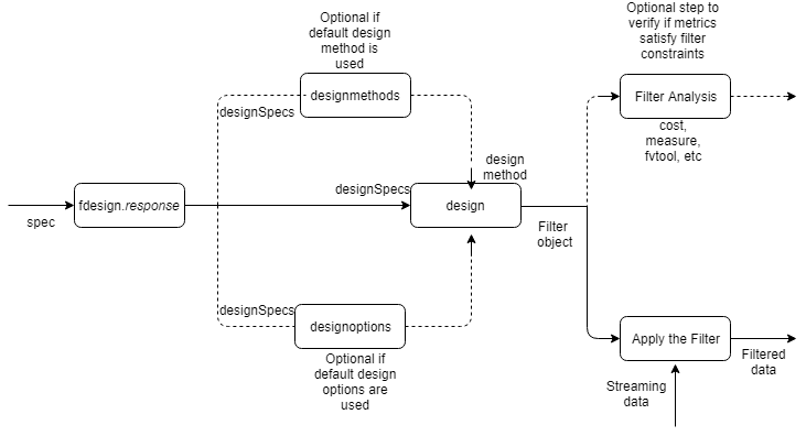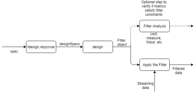 Вот схема рабочего процесса, которая показывает простую процедуру проектирования, анализа и, наконец, применения фильтра к потоковым данным.