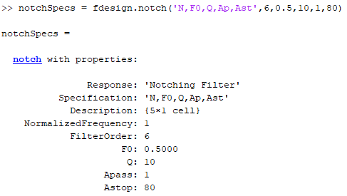 создает объект спецификации фильтра надрезов с порядком фильтра, частотой центра и коэффициентом качества, указанным в notchSpecs = fdesign.notch(n,f0,q)n,f0, и qсоответственно.
