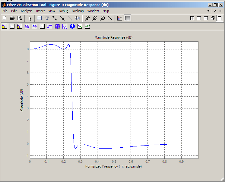 d = fdesign.parameq('N,Flow,Fhigh,Gref,G0,GBW,Gst',... 4,.3,.5,0,-12,-10,-1); Hd = design(d,'cheby2'); fvtool(Hd)