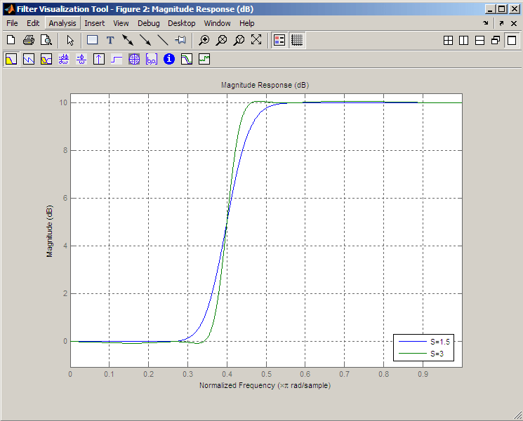 N=4; F0 = 1; Fc = .4; % Cutoff Frequency G0 = 10; S = 1.5; S2=3; f = fdesign.parameq('N,F0,Fc,S,G0',N,F0,Fc,S,G0); h1 = design(f); f.S=3; h2=design(f); hfvt=fvtool([h1 h2]); set(hfvt,'Filters',[h1 h2]); legend(hfvt,'S=1.5','S=3');