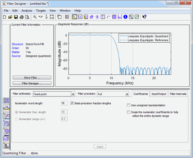 Раздел «Ввод/вывод» на панели «Установка параметров квантования» filterDesigner приложение поддерживает только подписанные типы данных.