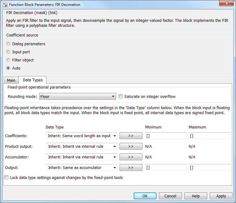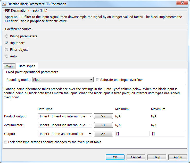 Когда блок вводится с фиксированной точкой, все внутренние типы данных подписываются значениями с фиксированной точкой.