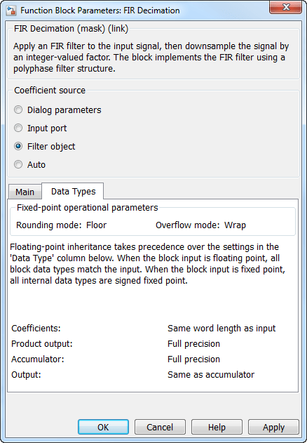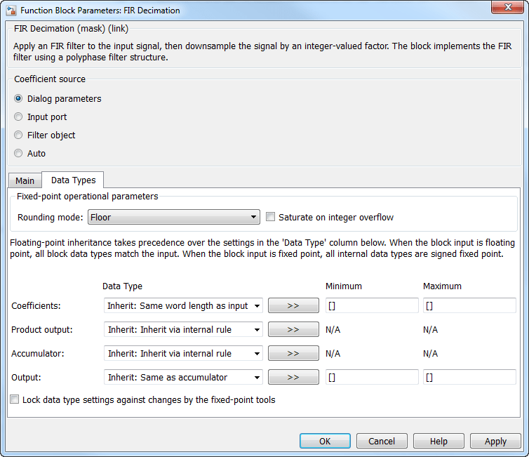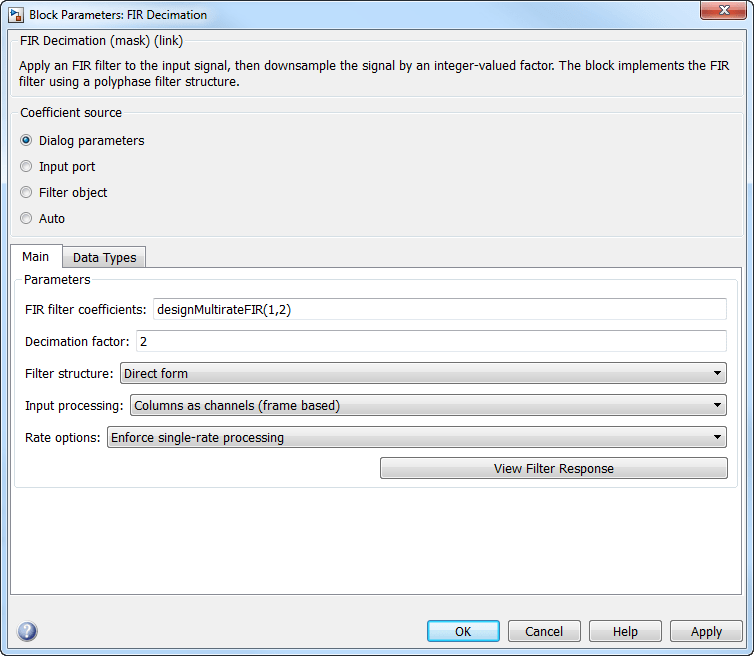 Блок децимации FIR может работать в четырех различных режимах. Выберите режим в поле группы Источник коэффициента.
