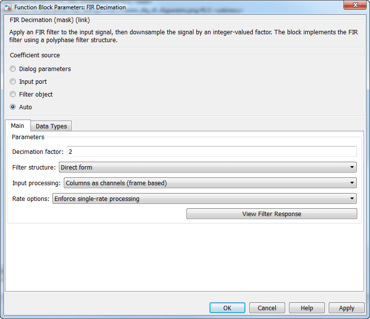 При выборе параметра «Автоматически» блок проектирует дециматор с коэффициентом прореживания, указанным в поле «Коэффициент прореживания». designMultirateFIR функция создает фильтр и возвращает коэффициенты, используемые блоком.