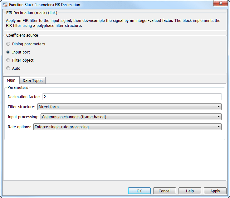 Входной порт (Input port) - указывает коэффициенты фильтра в качестве входных данных блока. Значения коэффициентов настраиваются (могут изменяться во время моделирования), а их свойства должны оставаться постоянными.
