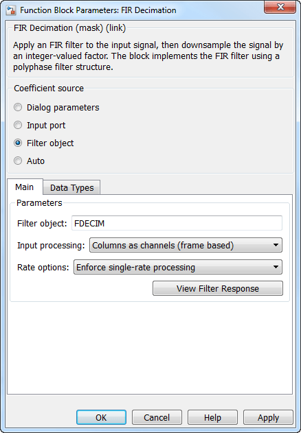 Объект Filter - укажите фильтр с помощью dsp.FIRDecimator Системный объект.