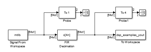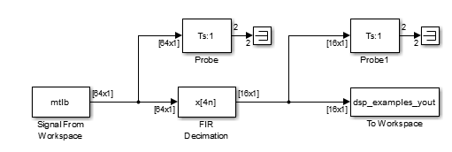 В модели ex_firdecimation_ref2 блок децимации КИХ прореживает одноканальный вход с размером кадра 64. Поскольку блок выполняет односкоростную обработку, а параметр коэффициента прореживания имеет значение 4, выходной сигнал блока децимации КИХ имеет размер кадра 16. Как показано на следующем рисунке, вход и выход блока децимации КИХ имеют одинаковую частоту дискретизации.