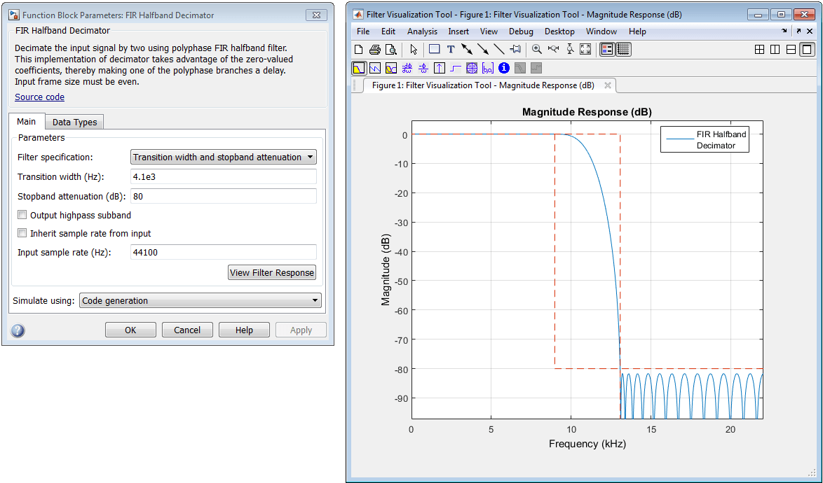 Открывает окно Инструмент визуализации фильтра (Filter Visualization Tool) FVTool (FVTool) и отображает амплитуду/фазовую характеристику дециматора полусферического диапазона (FIR Halfband Decimator). Ответ основан на параметрах диалогового окна блока. Изменения, внесенные в эти параметры, обновляют FVTool.