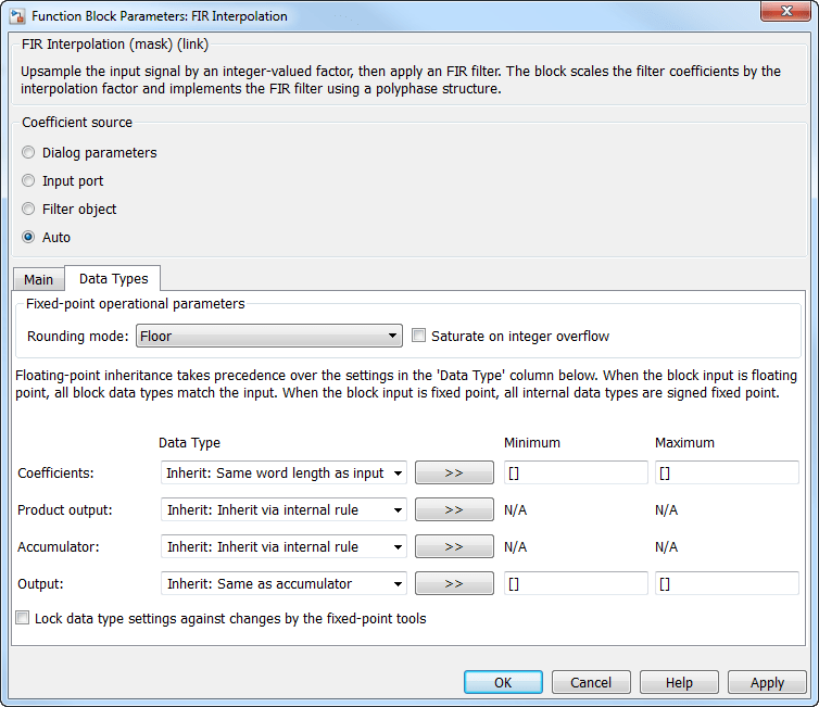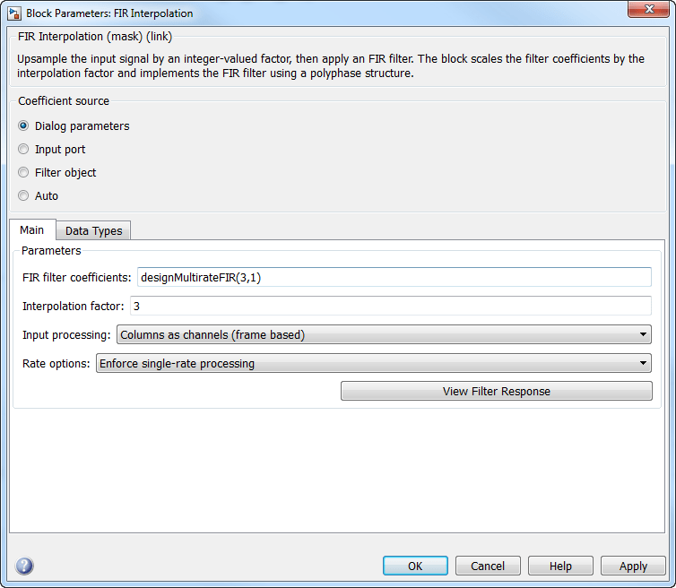 При выборе опции «Авто» блок проектирует FIR-интерполятор с коэффициентом интерполяции, указанным в поле «Коэффициент интерполяции». designMultirateFIR функция создает фильтр и возвращает коэффициенты, используемые блоком.