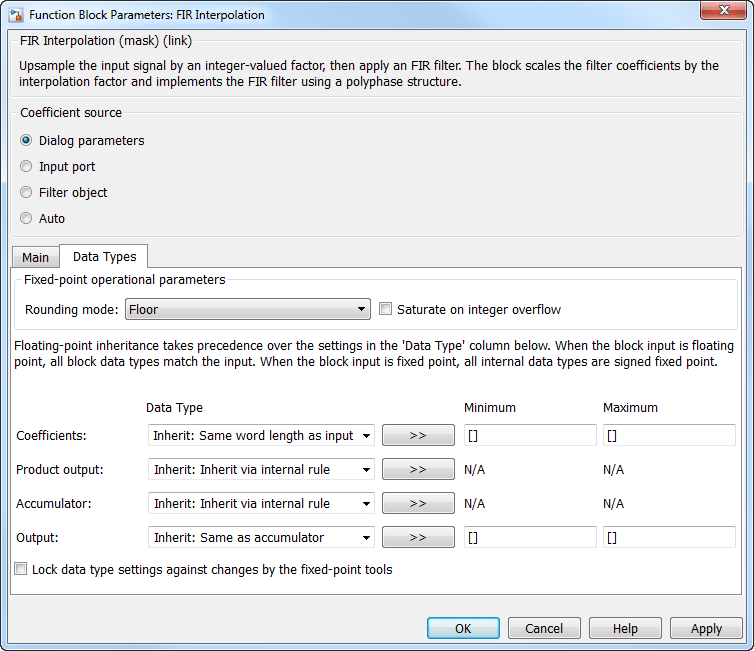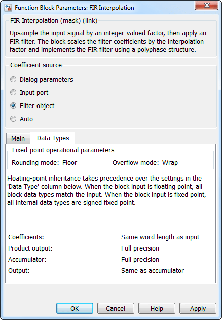В диалоговом окне Блок FIR-интерполяции (FIR Interpolation block) отображаются различные элементы в зависимости от выбора параметров диалога, входного порта, объекта фильтра или параметра «Авто» в поле группы «Исходный коэффициент».