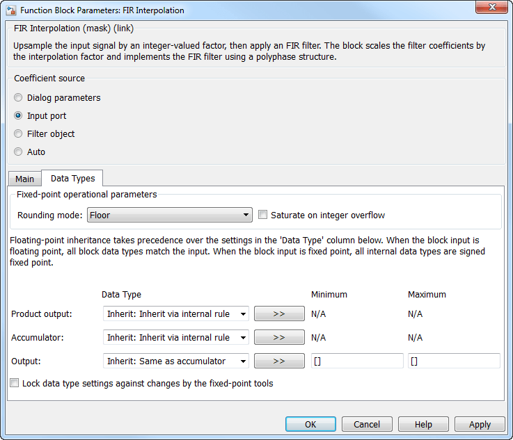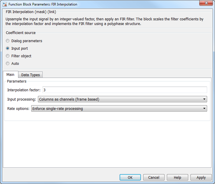 Входной порт (Input port) - указывает коэффициенты фильтра в качестве входных данных блока. Значения коэффициентов настраиваются (могут изменяться во время моделирования), а их свойства должны оставаться постоянными.