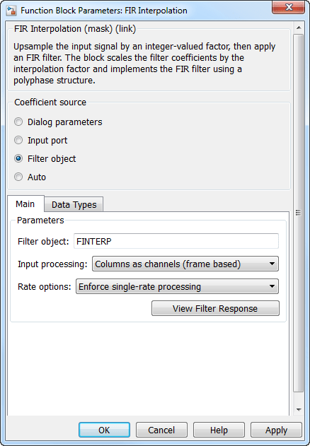 Объект Filter - укажите фильтр с помощью dsp.FIRInterpolator object™ системы.