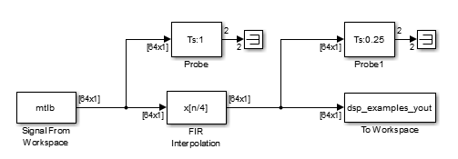В ex_firinterpolation_ref1 блок интерполяции КИХ интерполирует одноканальный вход с периодом кадра 1 секунда (время выборки = 1/64 и Выборки на кадр = 64). Поскольку блок выполняет многоскоростную обработку на основе кадров, а параметр коэффициента интерполяции установлен в 4, выход блока FIR интерполяции имеет период кадра, равный 0.25 секунд. Как показано на следующем рисунке, вход и выход блока интерполяции КИХ имеют одинаковый размер кадра, но частота дискретизации выхода равна 1/4 В раз больше входного значения.