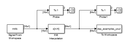 В ex_firinterpolation_ref2 блок интерполяции КИХ интерполирует одноканальный вход с размером кадра, равным 16. Поскольку блок выполняет односкоростную обработку, а параметр коэффициента интерполяции имеет значение 4, выходной сигнал блока FIR интерполяции имеет размер кадра, равный 64. Как показано на следующем рисунке, входной и выходной сигналы блока FIR интерполяции имеют одинаковую частоту дискретизации.