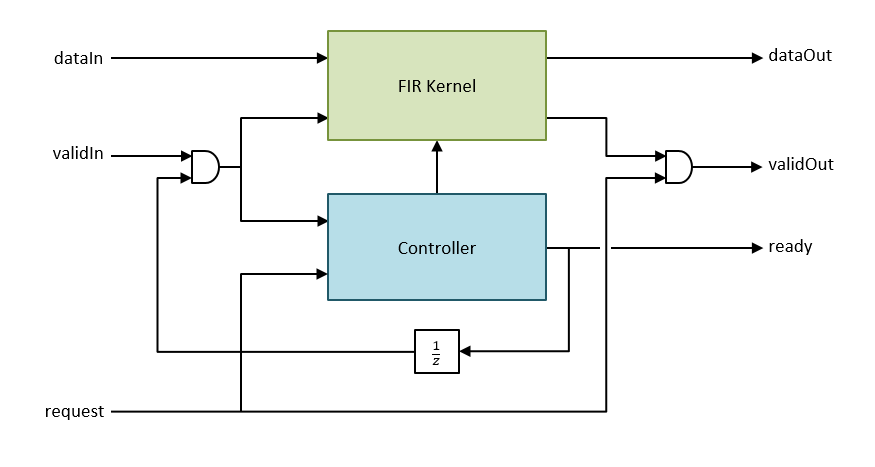 Для отслеживания потока выборок можно использовать порты управления вводом и выводом. В конфигурации по умолчанию блок использует управляющие сигналы validIn и validOut. Для дополнительного управления потоком можно включить готовый выходной сигнал и входной сигнал запроса.