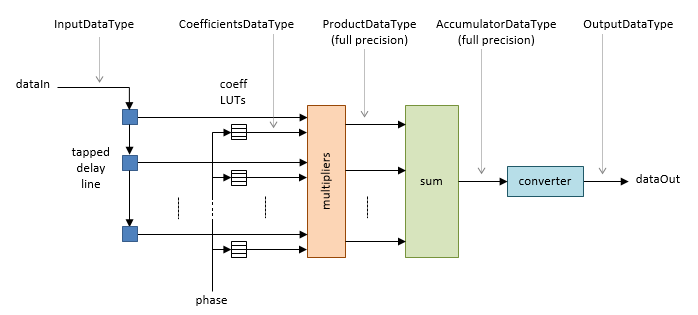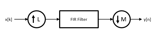 Блок увеличивает выборку входного сигнала на целочисленный коэффициент L, применяет его к КИХ-фильтру и понижает выборку входного сигнала на целочисленный коэффициент М.