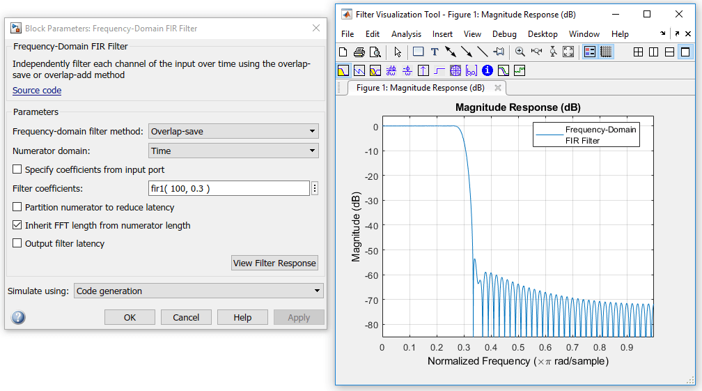 Блок FIR-фильтра частотной области реализует фильтрацию на основе частотной области с быстрым преобразованием Фурье (FFT) для фильтрации потокового входного сигнала. Во временной области операция фильтрации включает свертку между входным сигналом и импульсной характеристикой фильтра с конечной импульсной характеристикой (КИХ). В частотной области операция фильтрации включает в себя умножение преобразования Фурье входного сигнала и преобразования Фурье импульсной характеристики. Фильтрация в частотной области становится более эффективной, чем фильтрация во временной области, по мере увеличения импульсной характеристики. Можно задать коэффициенты фильтра непосредственно в частотной области, установив для области числителя значение Frequency.
