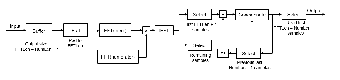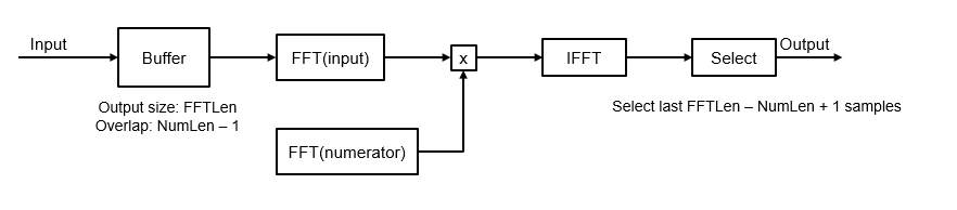 Входной поток разделяется на перекрывающиеся блоки размера FFTLen с коэффициентом перекрытия NumLen - 1 выборок. FFTLen - длина FFT, а NumLen - длина числителя фильтра FIR. FFT каждого блока входных выборок вычисляется и умножается на FFTLen FFT числителя FIR. Выполняется обратное быстрое преобразование Фурье (IFFT) результата, и сохраняются последние выборки FFTLen - NumLen + 1. Остальные образцы сбрасывают.
