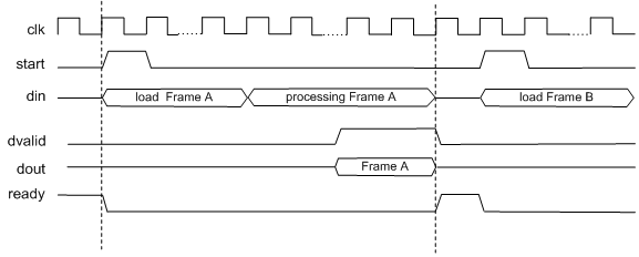 Один тактовый цикл после start триггер, блок начинает загружать данные и ready сигнал отклоняется. В течение интервала, когда блок загружает, обрабатывает и выводит данные, ready низкий, и start сигнал игнорируется.