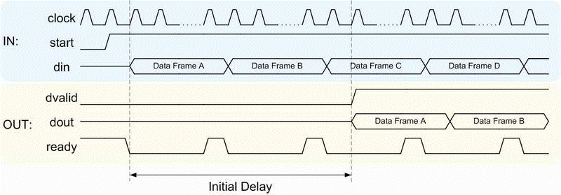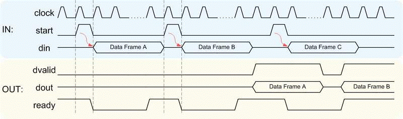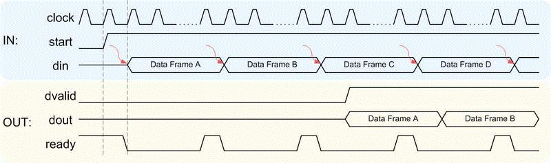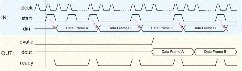 Один тактовый цикл после start триггер, блок начинает загружать данные в din. После первого кадра потоковых данных блок начинает принимать следующий кадр потоковых данных.