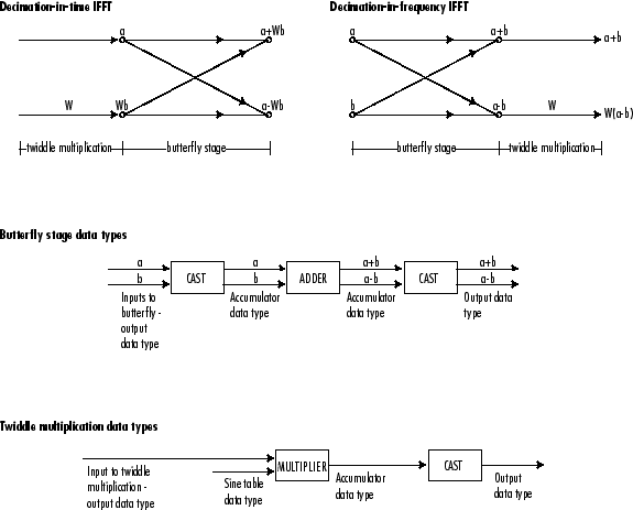 Блок IFFT сначала передает входные данные типу выходных данных, а затем сохраняет их в выходном буфере. Затем каждая ступень бабочки обрабатывает сигналы в накопительном типе данных, при этом конечный выход бабочки возвращается в выходной тип данных. Блок умножается на сдвоенный коэффициент перед каждой ступенью бабочки в IFFT прореживания во времени и после каждой ступени бабочки в IFFT прореживания в частоте.