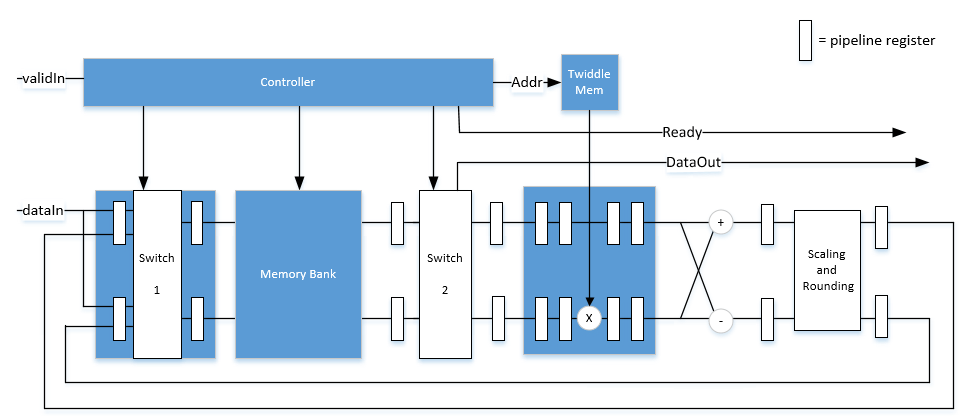 Пакетная архитектура Radix 2 реализует FFT с использованием единого комплексного умножителя бабочек. Алгоритм не может запуститься, пока не сохранит весь входной кадр, и не сможет принять следующий кадр до завершения вычислений. Выходной порт готовности указывает, когда алгоритм готов к новым данным. На схеме показана архитектура пакета с конвейерными регистрами.
