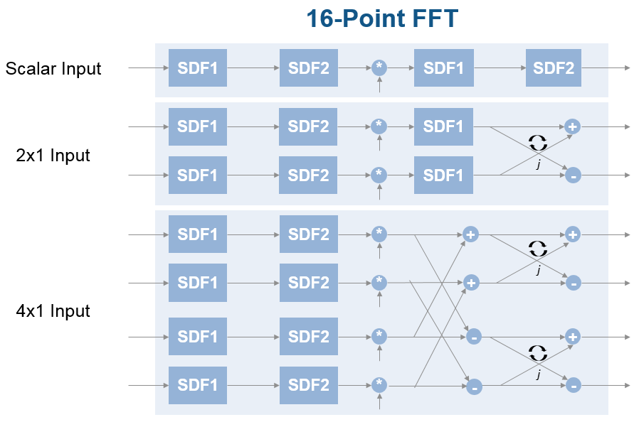 Streaming Radix 2^2 - Используйте эту архитектуру для высокопроизводительных приложений. Эта архитектура поддерживает скалярные или векторные входные данные. С помощью векторного ввода можно достичь пропускной способности giga-sample-per-second (GSPS).