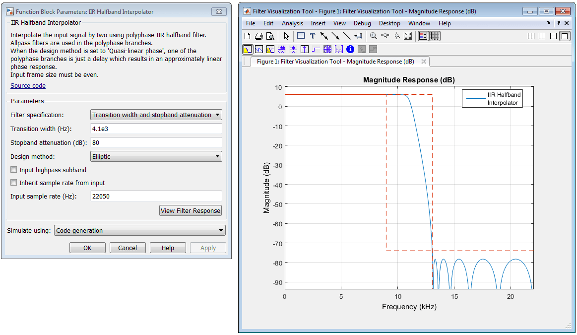 Блок межполосного интерполятора БИХ выполняет эффективную многофазную интерполяцию входного сигнала в два раза. Для проектирования полуполосного фильтра можно указать блок для использования эллиптической конструкции или квазилинейной фазовой конструкции. Блок использует эти методы проектирования для вычисления коэффициентов фильтра. Для фильтрации входных данных блок использует многофазную структуру. Фильтры allpass в многофазной структуре имеют форму минимального множителя.