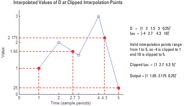Поскольку D имеет четыре выборки, допустимые точки интерполяции находятся в диапазоне от 1 до 4. Блок отсекает точку интерполяции от 10 до 4 и точку от -3 до 1, что приводит к отсеченному вектору интерполяции. IPtsClipped = [4 2.6 1]'.